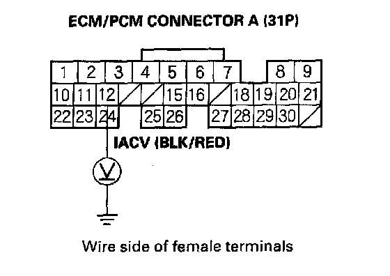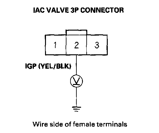 6. Measure voltage between IAC valve 3P connector terminal No.2 and body ground.