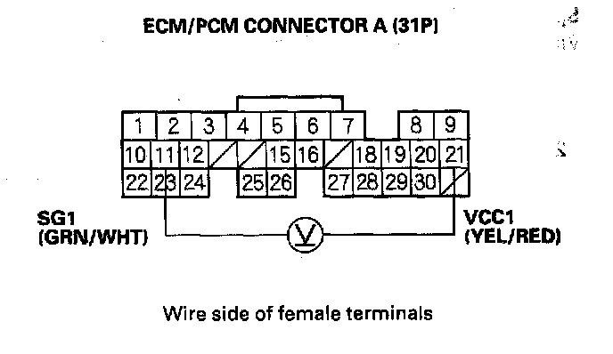 7. Measure voltage between ECM/PCM connector terminals A11 and A21.