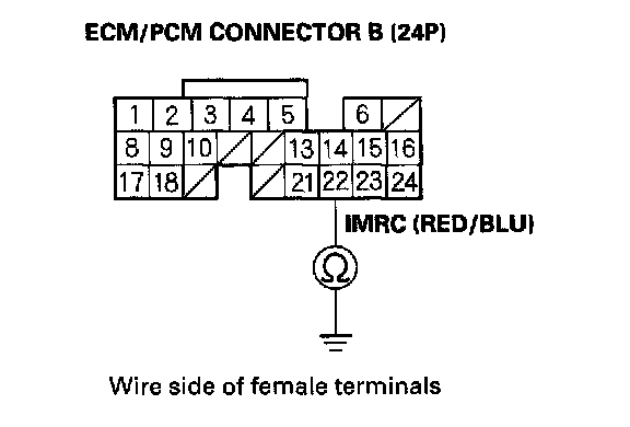 14. Check for continuity between ECM/PCM connector terminal B22 and body ground.