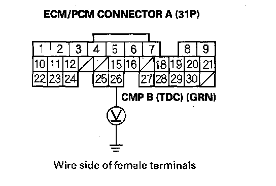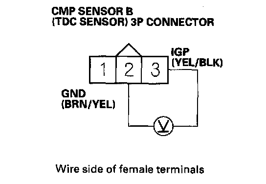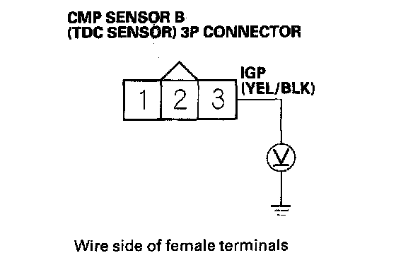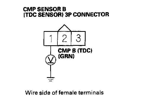 7. Measure voltage between CMP sensor B (TDC sensor) 3P connector terminal No.1 and body ground.