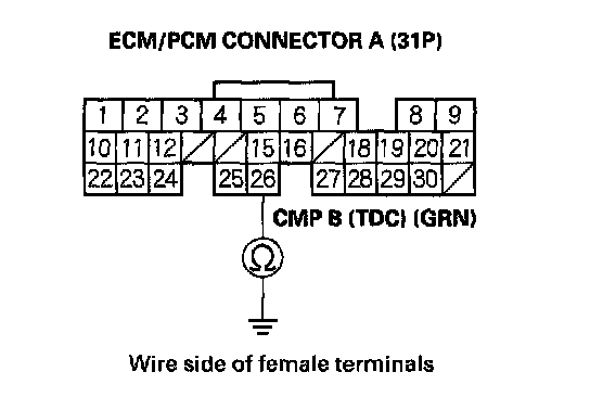 13. Check for continuity between ECM/PCM connector terminal A26 and body ground.