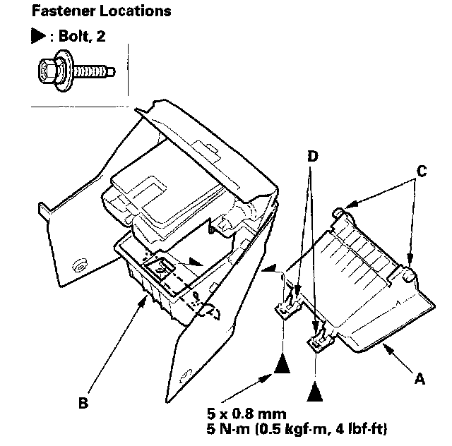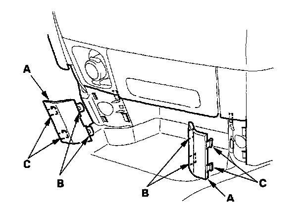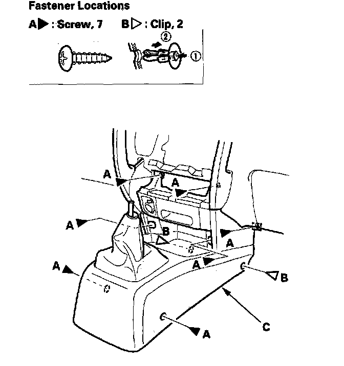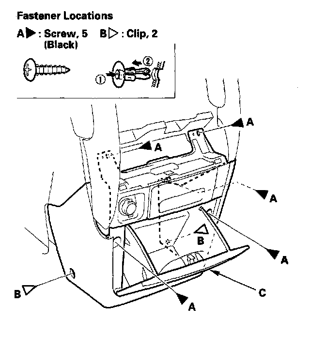 4. Remove the screws (A) and clips (B) from the dashboard center lower cover (C).