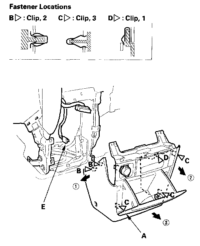 3. Disconnect the accessory power socket connector (E) and coin pocket light connector.
