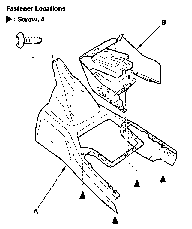 6. If necessary, remove the screws, then separate the center console (A) and center lower cover (B).