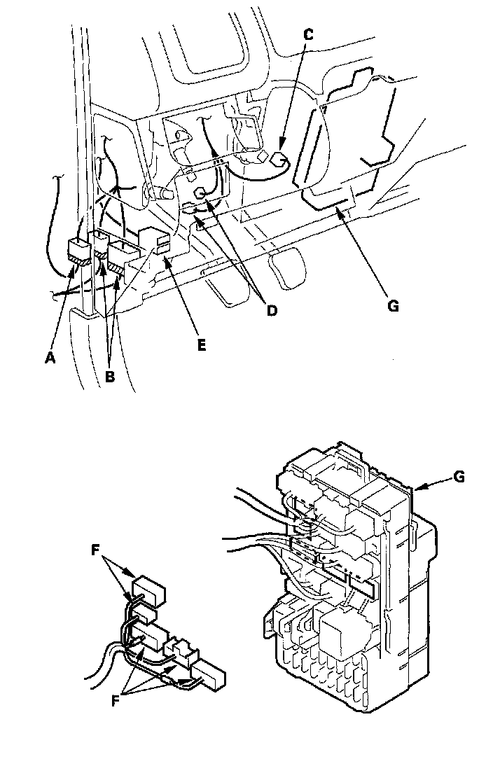 4. From under the dash, disconnect the interior wire harness connector (A), driver's door wire harness connectors (B), brake switch connector (C), and clutch switch connectors (D) (on M/T model). Remove the moonroof relay (E) from the bracket, and disconnect the engine compartment wire harness connectors (F) from the under-dash fuse/ relay box (G).