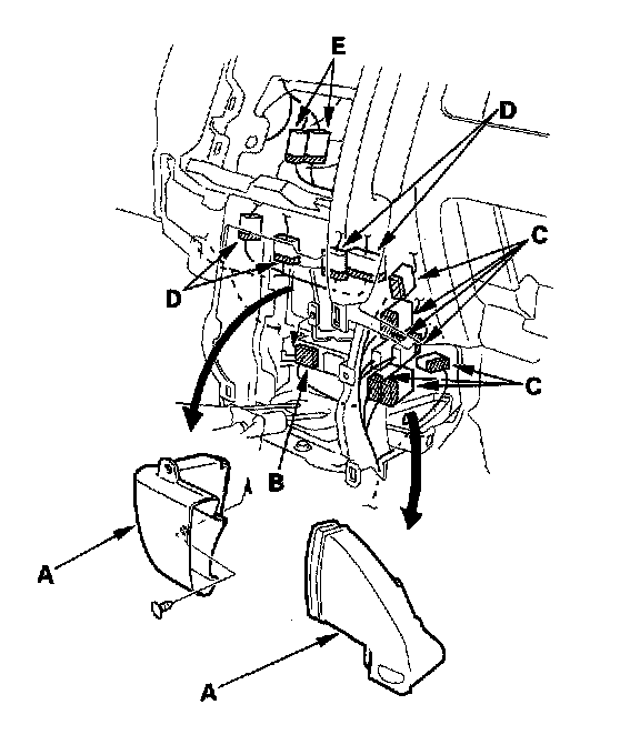 5. Remove the rear heater joint ducts (A). Disconnect the SRS control unit connector (B), floor wire harness connectors (C), engine compartment wire harness connectors (D), and heater subharness connectors (E).