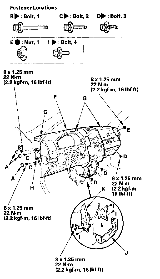 8. Remove the caps (A), then remove the bolts (B, C, D) and nut (E), and lift up on the dashboard (F) to release it from the guide pins (G, H) on the body. When pulling the dashboard out, remove the center frame mounting bolts (I), then remove the center bracket (J) from the center frame (K).