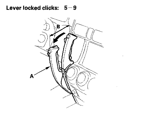 Check1. Pull the parking brake lever (A) with 196 N (20 kgf, 44 lbs) of force to fully apply the parking brake. The parking brake lever should be locked within the specified number of clicks (B).