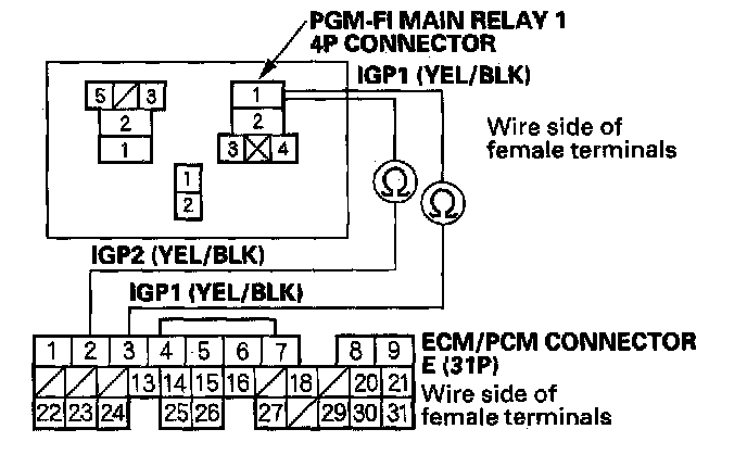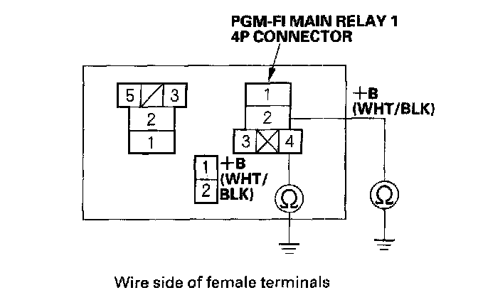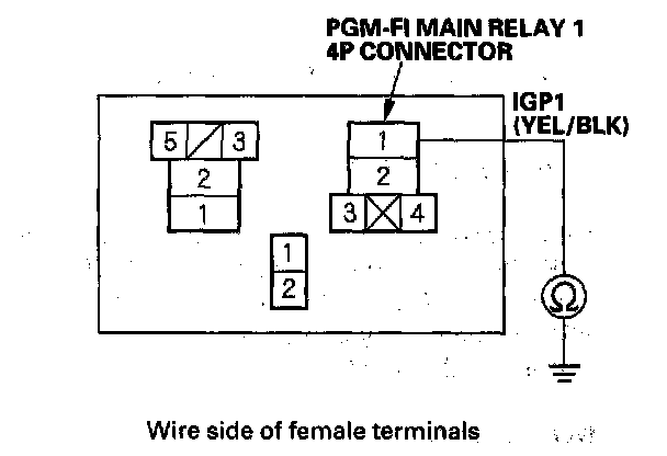 18. Check for continuity between body ground and PGM-FI main relay 1 4P connector terminals No.2 and No.4 individually.