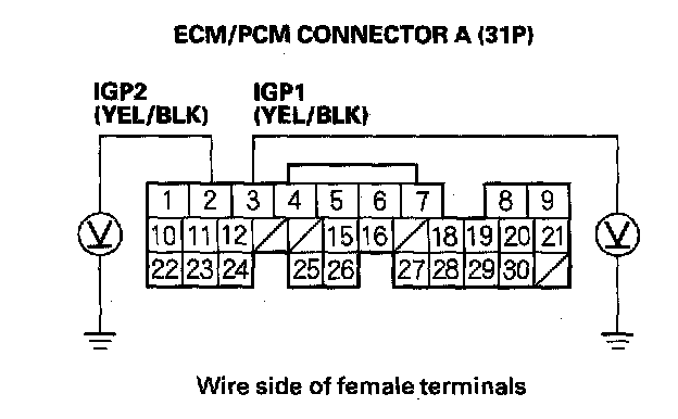 46. Measure voltage between body ground and ECM/PCM connector terminals A2 and A3 individually.