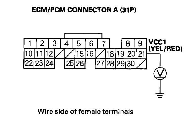 54. Measure voltage between body ground and ECM/PCM connector terminal A21.