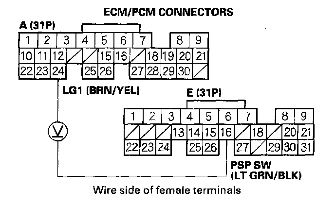 5. Measure voltage between ECM/PCM connector terminals A24 and E16.