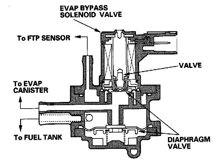 The EVAP two way valve sends fuel vapor to the EVAP canister corresponding to the pressure inside the fuel tank and prevents excessive vacuum in the fuel tank by drawing in fresh air through the EVAP canister. The EVAP bypass solenoid valve opens to bypass the two way valve during the EVAP leak check.