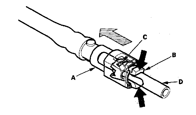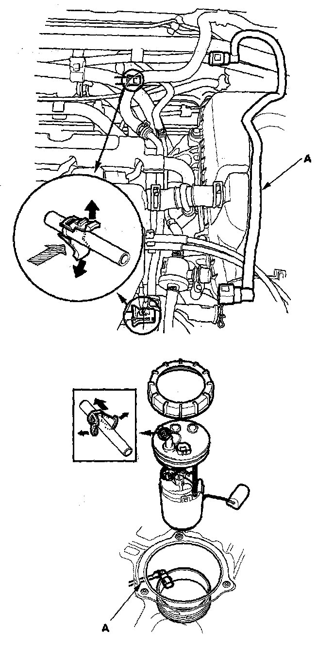 3. Before connecting a new fuel line/quick-connect fitting assembly (A), remove the old retainer from the mating line.