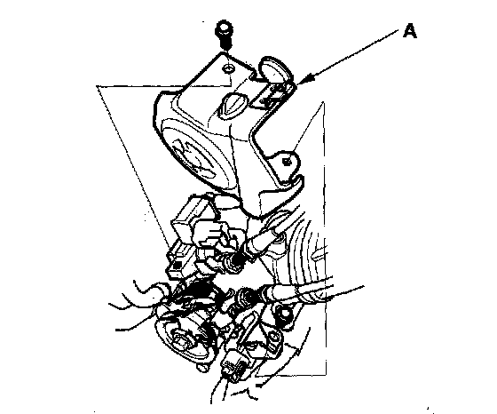 3. If the free play is not within spec (10-12 mm, 3/8-1/2 in.), remove the throttle linkage cover (A).