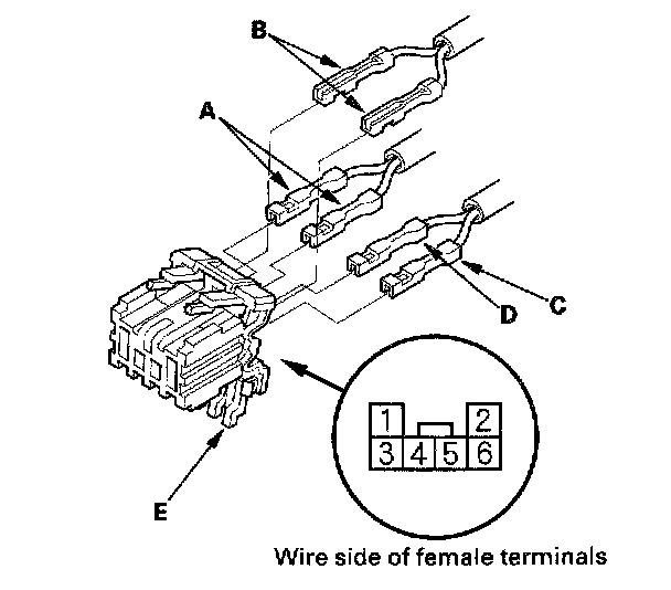 13. Remove the terminal (C) from the connector by pushing the lock tab (D) up in the connector using a thin blade screwdriver (E). Remove all six terminals.