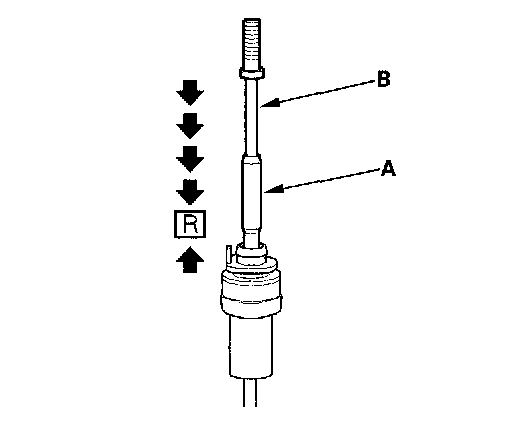 26. If necessary, push the shift cable until it stops, then release it. Pull the shift cable back one step so that the shift cable is in R. Do not hold the shift cable guide (A) to adjust the shift cable (B).
