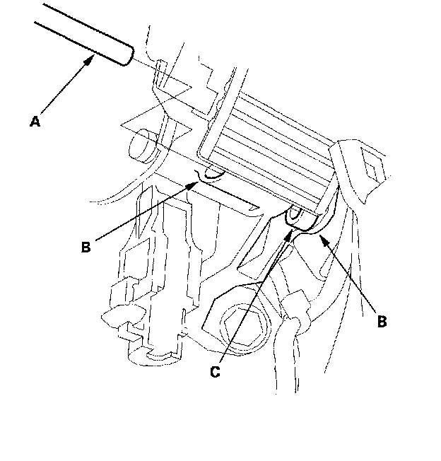 28. Insert a 6.0 mm (0.24 inch) pin (A) into the positioning holes (B) on the shift lever bracket base and through the positioning hole (C) on the shift lever. The shift lever is secured in the R position.