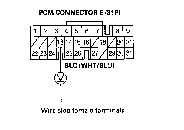 4. Measure the voltage between PCM connector terminal E13 and body ground.