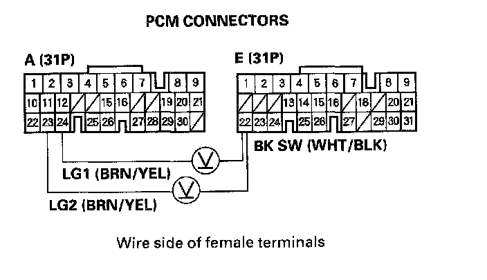 9. Press the brake pedal, and measure the voltage between PCM connector terminals E22 and A23 or A24.