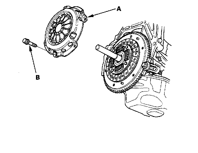 3. To prevent warping, unscrew the pressure plate mounting bolts (A) in a crisscross pattern in several steps, then remove the pressure plate (B).