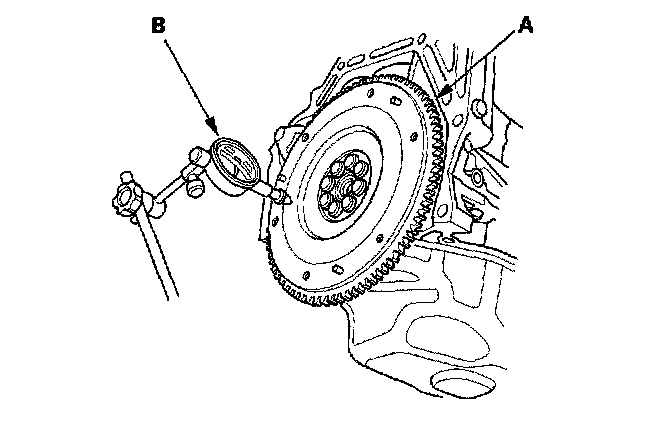 3. Measure the flywheel (A) runout using a dial indicator (B) through at least two full turns with the engine installed. Push against the flywheel each time you turn it to take up the crankshaft thrust washer clearance. If the runout is more than the service limit, replace the flywheel and recheck the runout. Resurfacing the flywheel is not recommended.