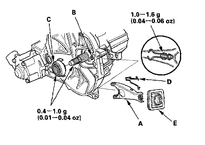 2. Remove the release fork (C) from the clutch housing (B) by squeezing the release fork set spring (D) with pliers. Remove the release bearing (E).