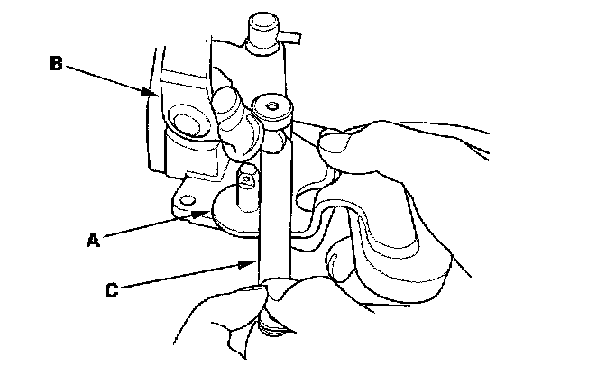Inspection1. Measure the clearance between shift lever (A) and the select lever (B) with a feeler gauge (C). If the clearance is more than the service limit, go to step 2.