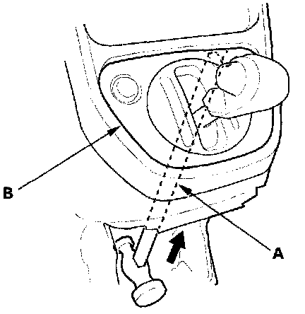 3. Using the handle end of a hammer (A), carefully insert the handle through the center lower cover opening, and push on the back side of the shift lever trim (B) to start to release the clips.