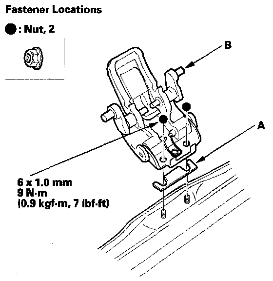 3. Remove the nuts and shim (A), then remove the glass latch (B).