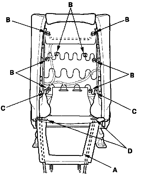 6. Turn over the seat back cover (A), release the inside springs (B) and hooks (C). With side airbag: Pull the side airbag harness and the OPDS harness (passenger's seat) out through a holes (D) in the seat-back cover.