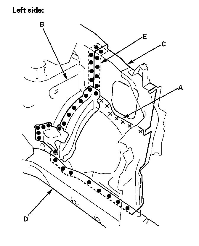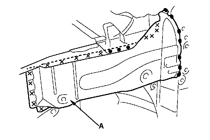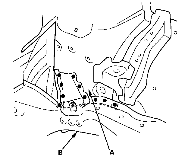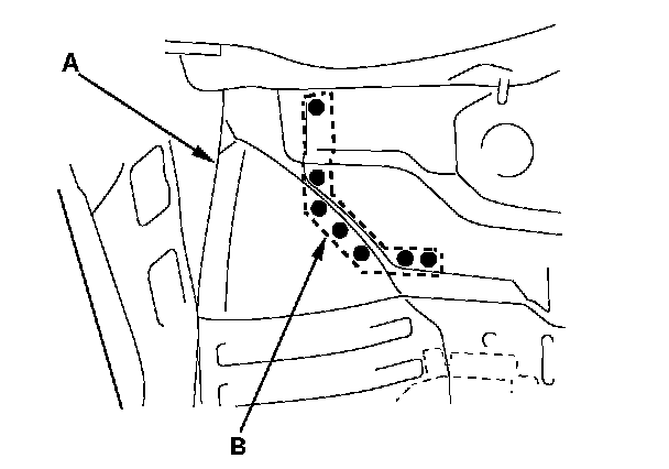 8. From passenger's compartment side, weld the dash board lower (A) and damper housing extension lower (B).