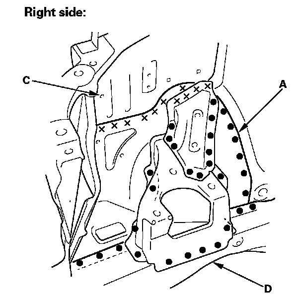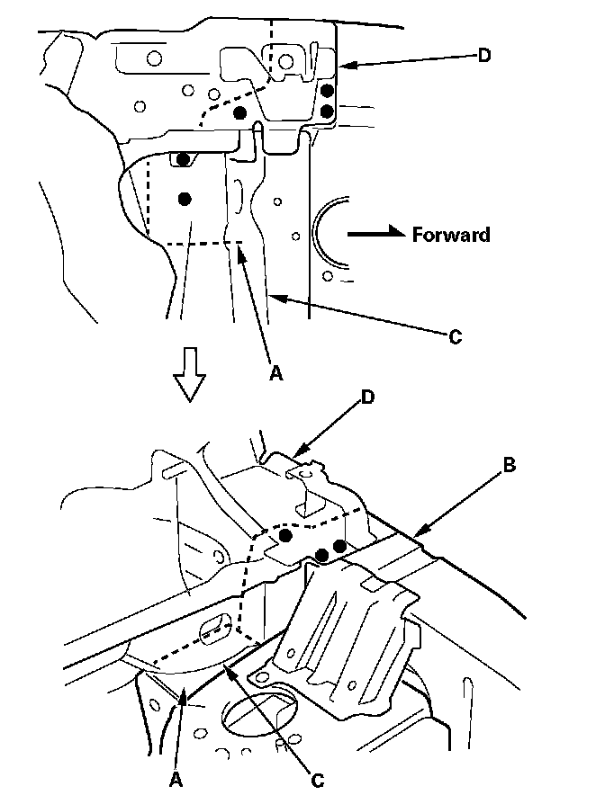 6. Main weld the damper housing extension upper (A)and front damper extension (B) to the dashboard upper (C) and dashboard upper side member (D).