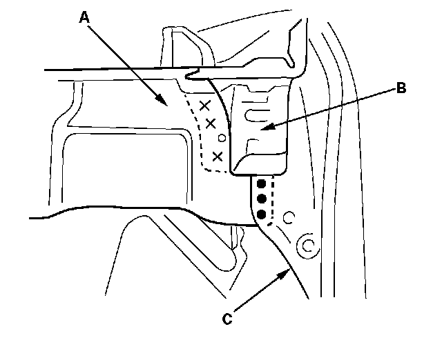 7. Main weld the front damper extension (A) to the dash board upper side member (B) and front inner lower pillar(C).