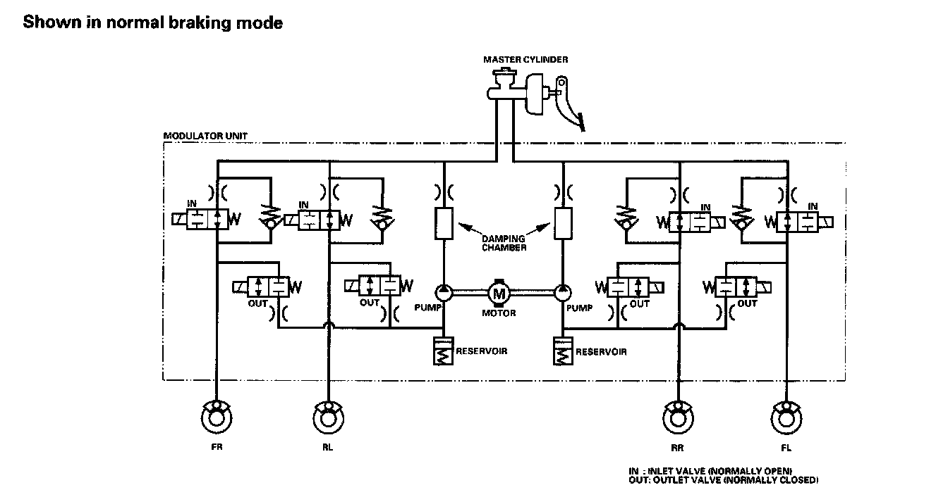 ABS ModulatorThe ABS modulator consists of inlet solenoid valves, outlet solenoid valves, reservoir, pump, and the pump motor. The modulator reduces the caliper fluid pressure directly. It is a circulating-type modulator because the brake fluid circulates through the caliper, reservoir, and the master cylinder. The hydraulic control has three modes: normal braking, pressure retaining, and pressure reducing. The hydraulic circuit is an independent four channel type, one channel for each wheel.