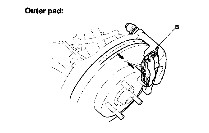 2. Check the thickness of the inner pad (A) and outer pad (B). Do not include the thickness of the brake pad backing plate.