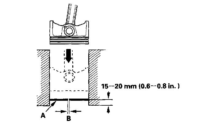 4. Using a piston, push a new ring (A) into the cylinder bore 15 - 20 mm (0.6 - 0.8 inch) from the bottom.