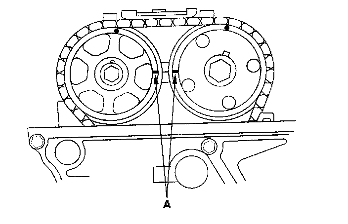 6. Check that the No. 1 piston TDC marks (A) on the variable Valve Timing Control (VTC) actuator and exhaust camshaft sprocket are aligned.