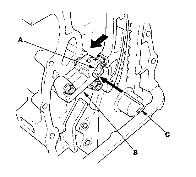 16. Align the holes on the lock (A) and the auto-tensioner (B), then insert a 1.5 mm (0.06 inch) diameter pin (C) into the holes. Turn the crankshaft clockwise to secure the pin.