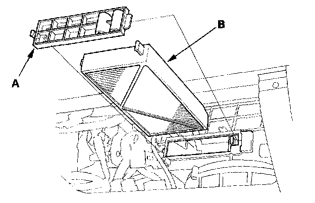 2. Remove the filter lid (A) from the blower unit, then pull out the first dust and pollen filter (B). Slide the second filter to the left, and pull it out.