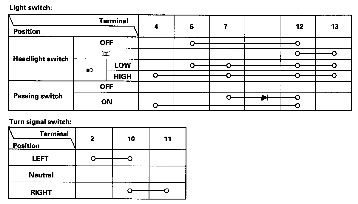 - If the terminals look OK, check for continuity between the terminals in each switch position according to the tables.
