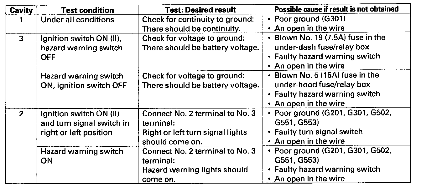 - If all the input tests prove OK, the turn signal/hazard relay must be faulty; replace it.