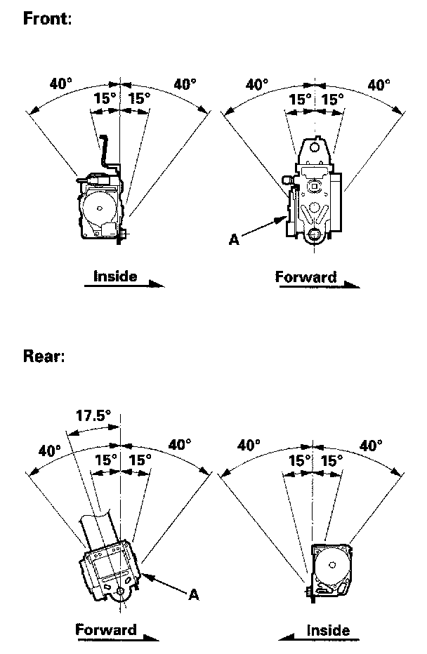 2. Make sure that the seat belt does not lock when the retractor (A) is leaned slowly up to 15 ° from the mounted position. The seat belt should lock when the retractor is leaned over 40 °. Do not attempt to disassemble the retractor.