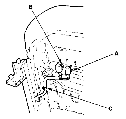4. From under the seat, detach the seat belt switch connector clip (A) and seat belt buckle tensioner connector clip (B). On the driver's seat, detach the harness clip (C).