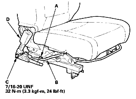 7. Remove the center anchor bolt (C), and remove the seat belt buckle (D).