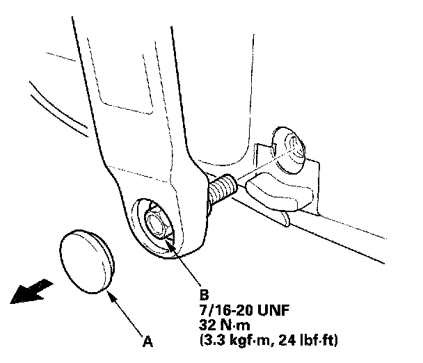 3. Using a wrapped flat-tip screwdriver with protective tape, pry the lower anchor cap (A) out, and remove the lower anchor bolt (B).