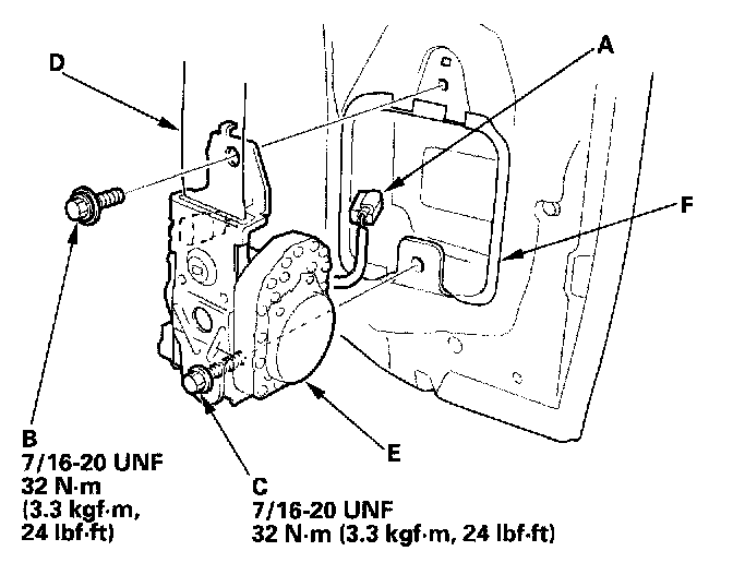 6. Disconnect the seat belt tensioner connector (A). Remove the upper retractor mounting bolt (B) and the lower retractor bolt (C), then remove the front seat belt (D) and retractor (E).