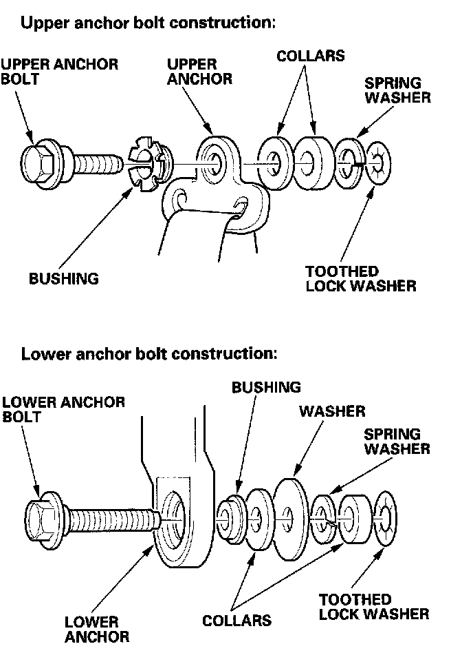 - Assemble the washers, collar, and bushing on the upper and lower anchor bolts as shown.