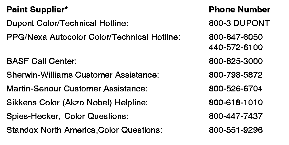 Paint formulations are determined by each paint company. For questions about formulas or color matching, call your paint supplier or one of the companies listed at the end of this service bulletin.