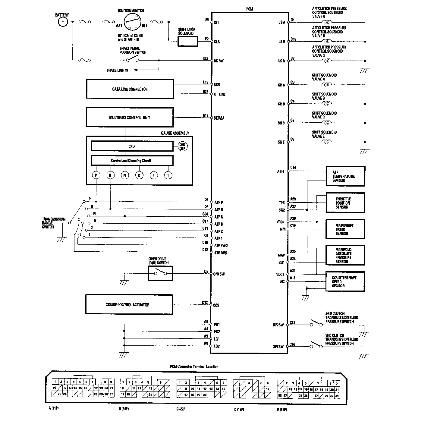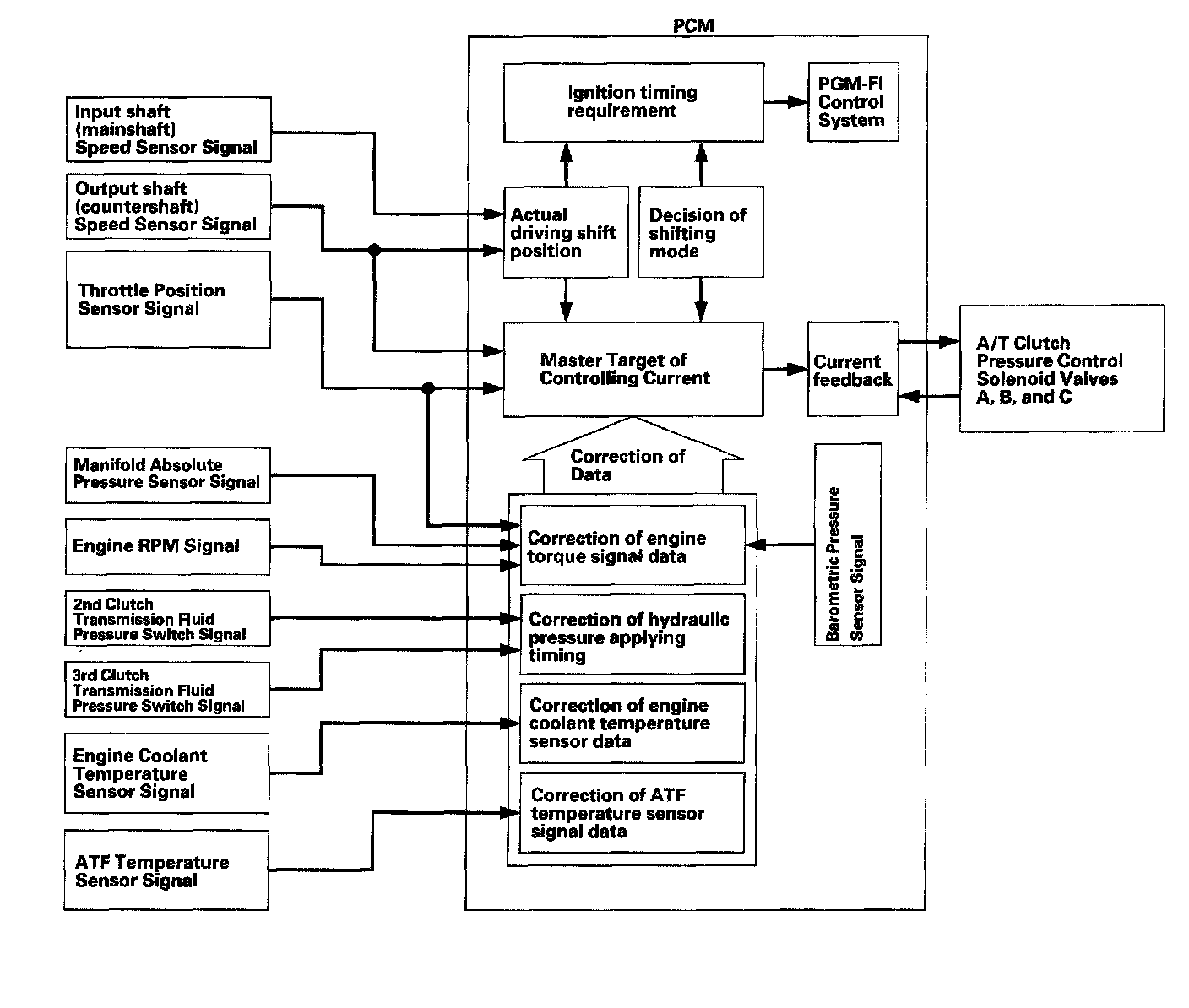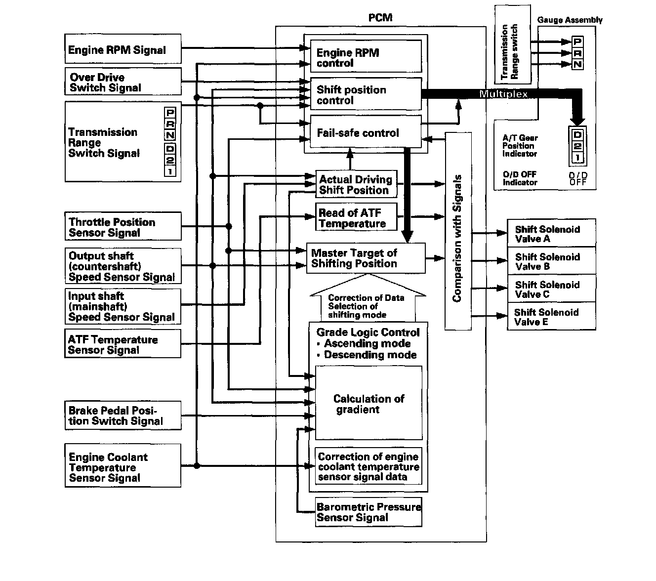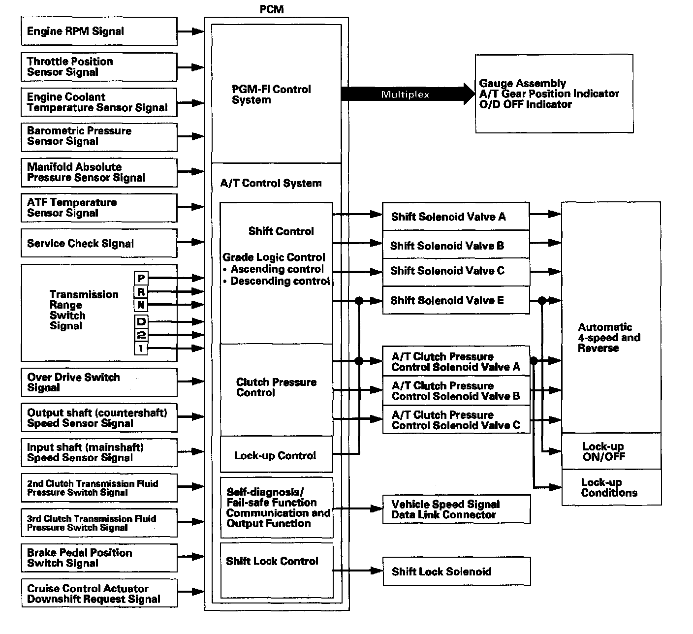 The PCM receives input signals from the sensors, switches, and other control units, performs data processing, and output signals for the engine control system and A/T control system. The A/T control system includes shift control, grade logic control, clutch pressure control, and lock-up control, all of which are stored in the PCM. The PCM switches the shift solenoid valves and the A/T clutch pressure control solenoid valves to control shifting transmission gears and lock-up torque converter clutch.